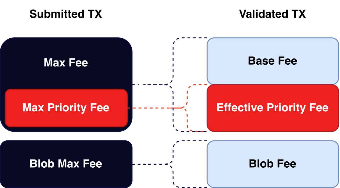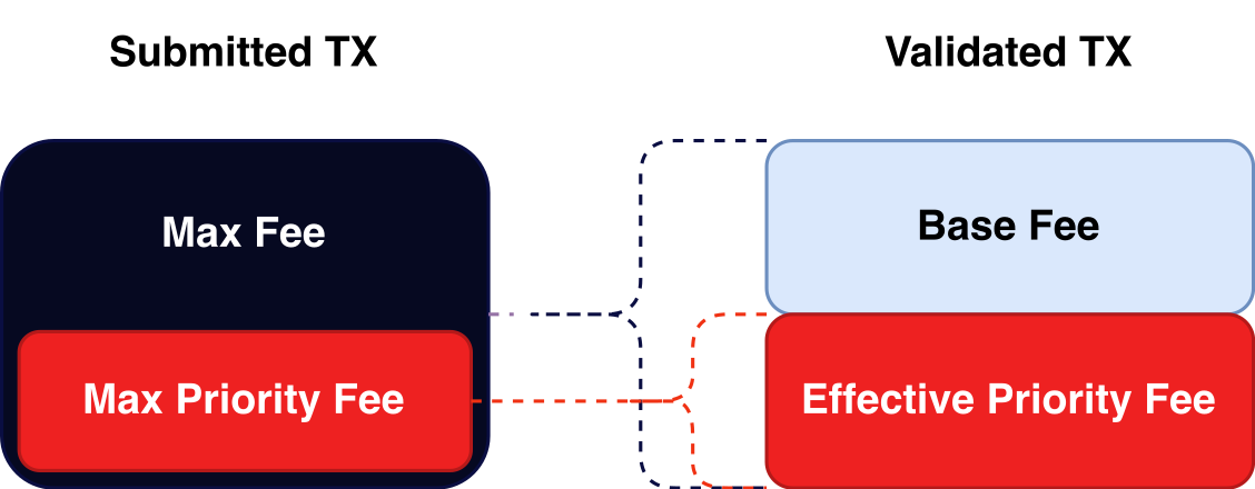 As in EIP-1559 fee scenarios, users specify a max fee and a max priority fee for the transaction's execution. The network sets the execution base fee, and the validator receives an effective priority fee on top of that base, capped so the total execution fee does not exceed the user's max fee.