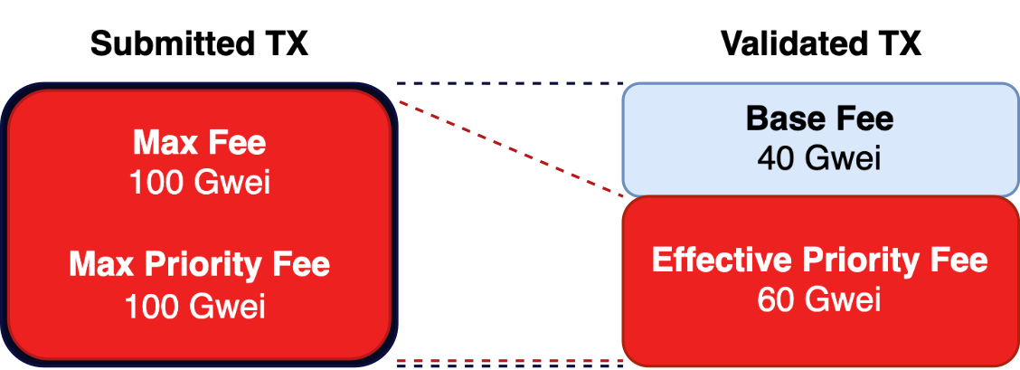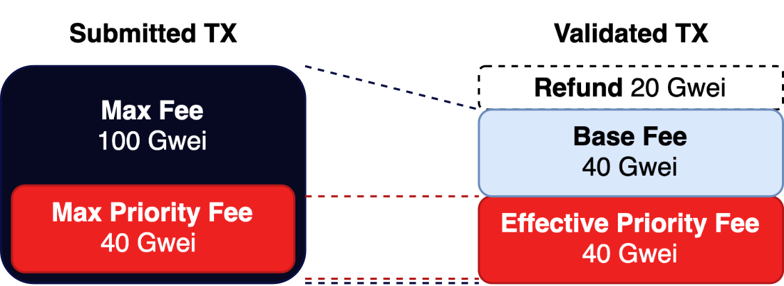 In this example, the execution base fee is 40 Gwei and the effective priority fee is capped at the max priority fee of 40 Gwei, for a total execution fee of 80 Gwei. Because the user's max fee is 100 Gwei, the remaining 20 Gwei is refunded.