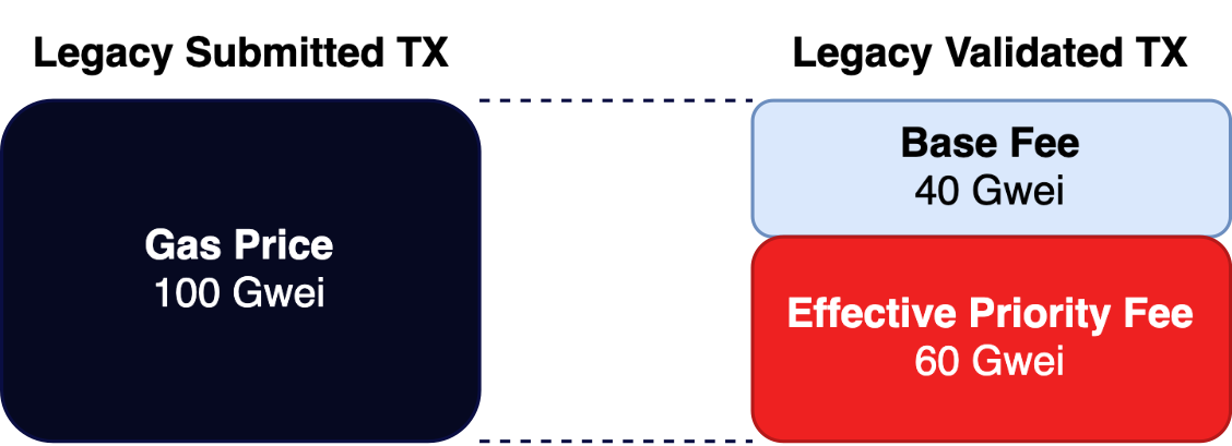 Legacy transactions that specify a single gas price continue to work under EIP-1559. Any portion of the gas price that exceeds the base fee is treated as a priority fee paid to the validator, making legacy transactions behave equivalently to setting equal max fee and max priority fee values.