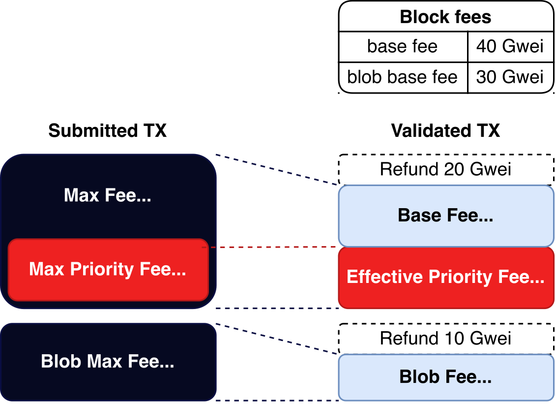 | blob max fee | user | Maximum blob fee the user is willing to pay per unit of blob gas. If the base blob fee is less than this amount, the difference is refunded to the user. Blob gas has no priority fee. |