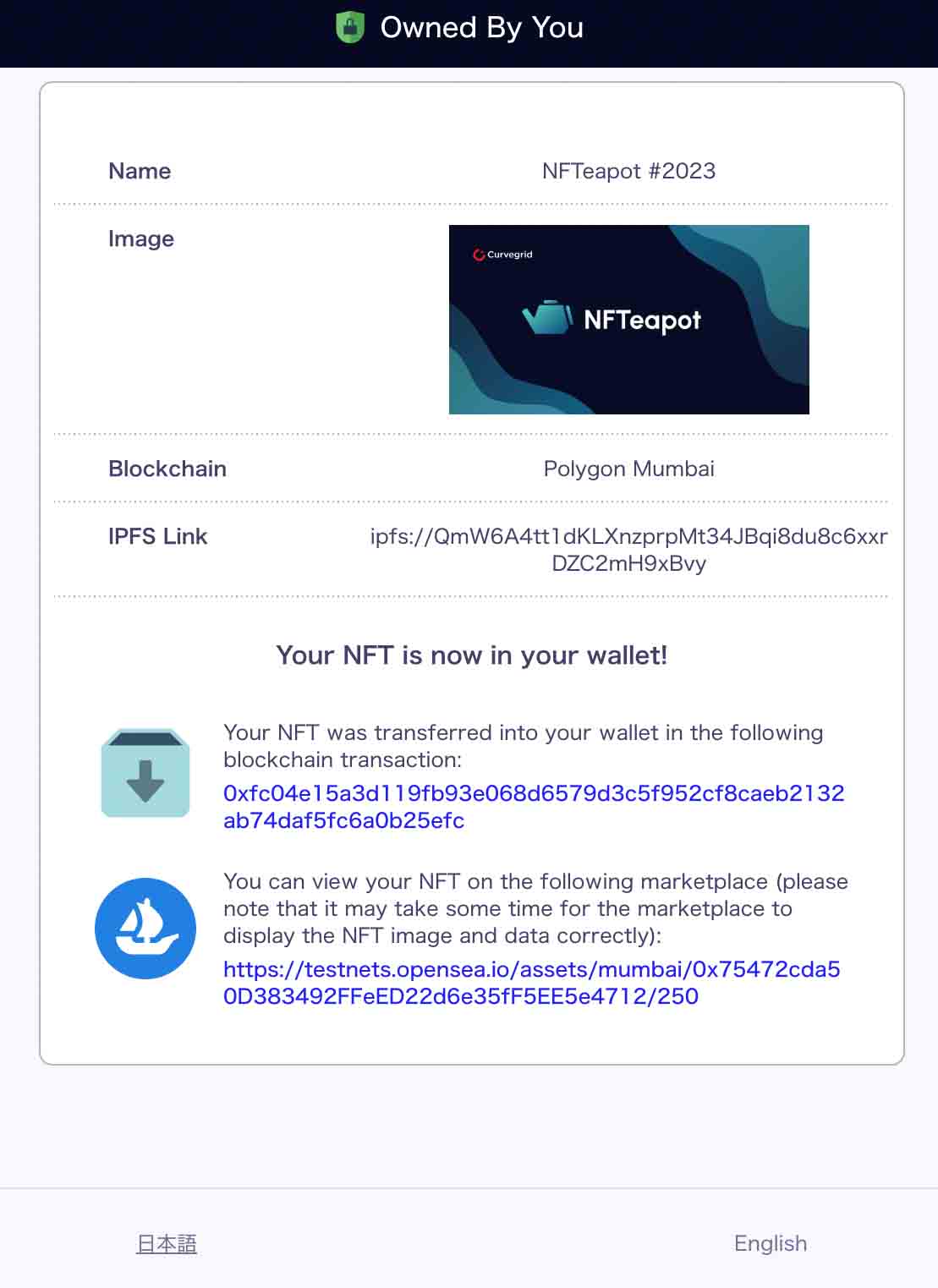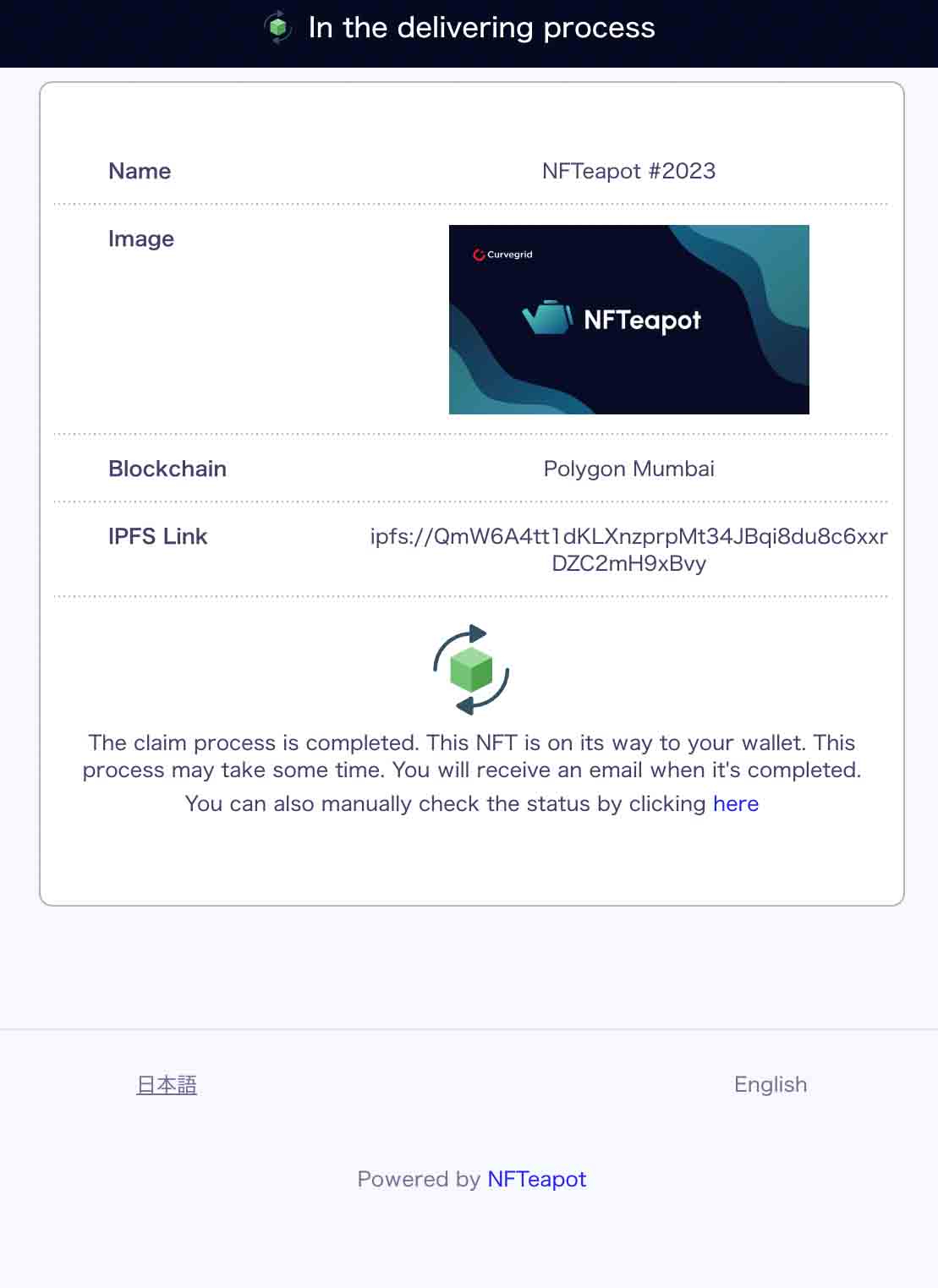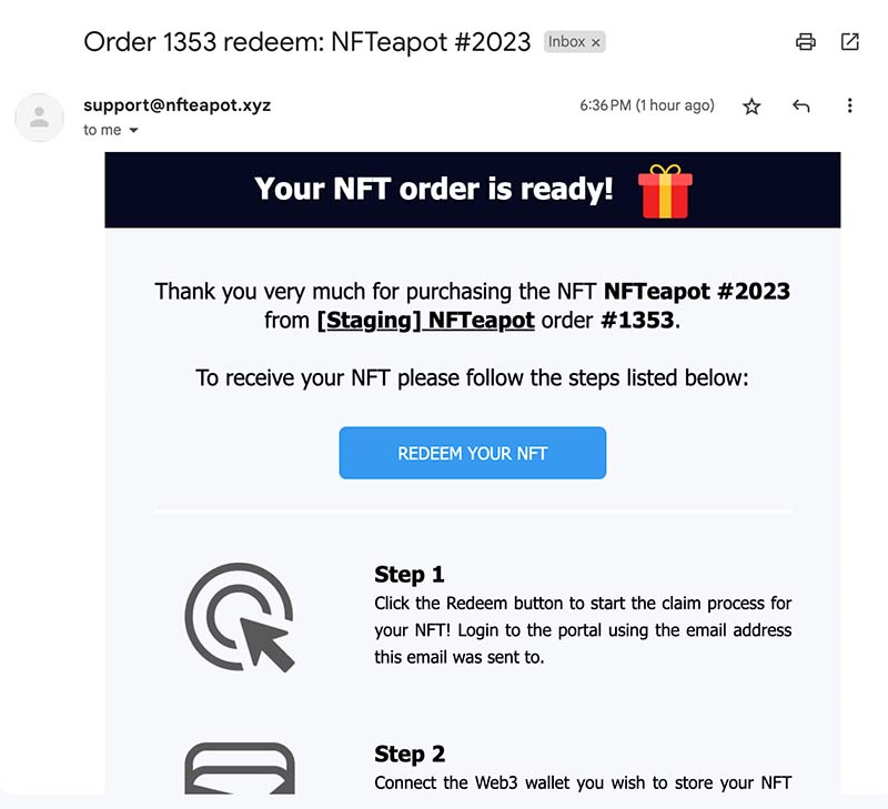 Once the NFT is ready to be minted, you will receive instructions from support@nfteapot.xyz similar to the one below with instructions on how to mint your NFT.
