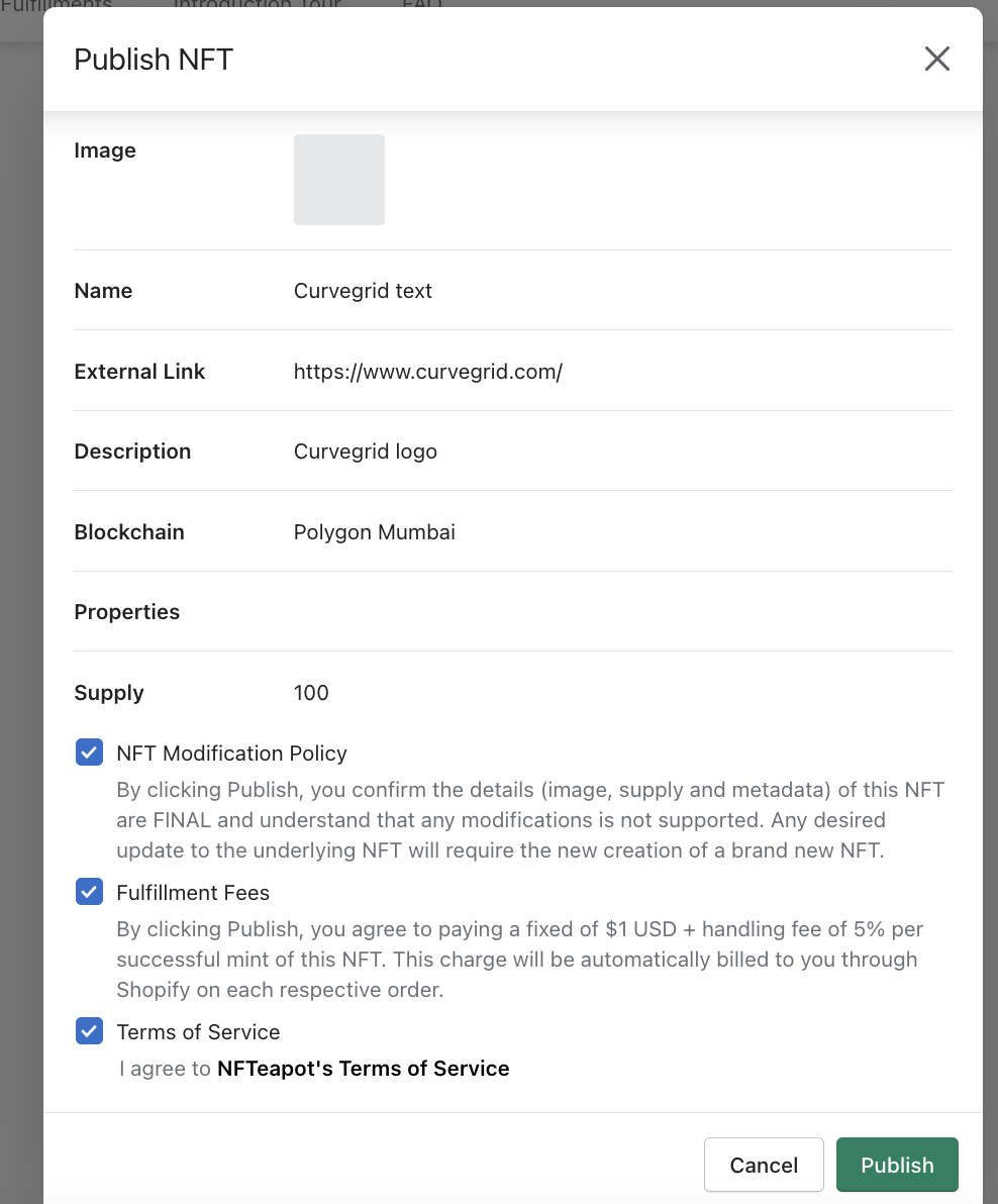 Publishyou will see a pop-up to confirm that your NFT has been published. Please review all fields to ensure you are happy with your creation. Once published, the metadata (ie. image, name, description, blockchain, supply) will be locked and cannot be changed.Finally, please review and agree to the modification policy, fulfillment fees, and all terms and conditions. To review the terms and conditions, please refer to https://www.curvegrid.com/utility-pages/nfteapot-terms-and-conditions.
