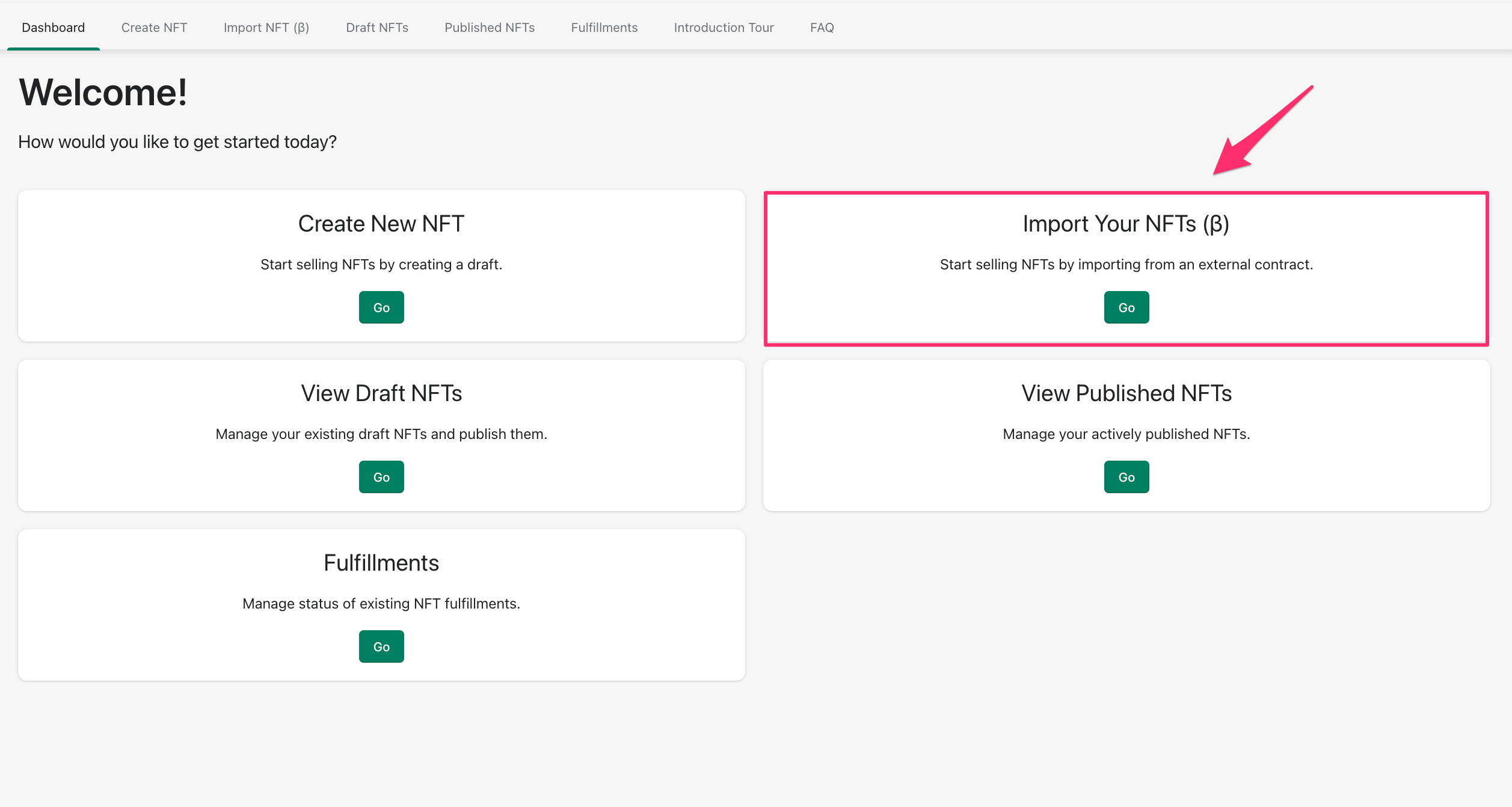 When you’re ready to import your NFTs into Shopify, navigate to Import Your NFTs shown on the NFTeapot homepage. Alternatively, you can also access this page through the Import NFT tab.