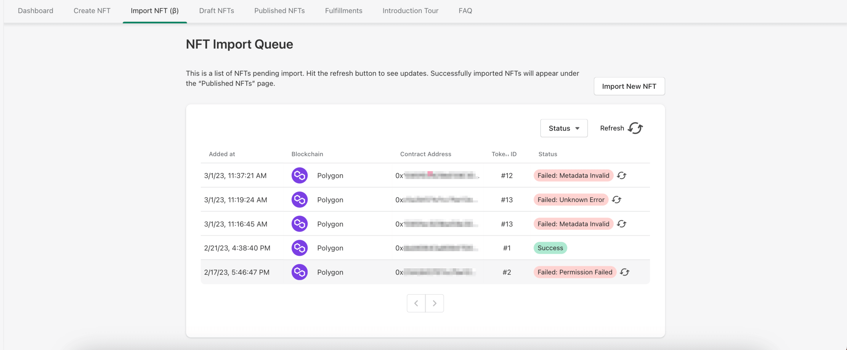 Import NFTsand NFTeapot will begin the import process which could take a few minutes per NFT. You can close the page after importing has begun and it will continue to process in the background. You will receive an email when the import is complete. -