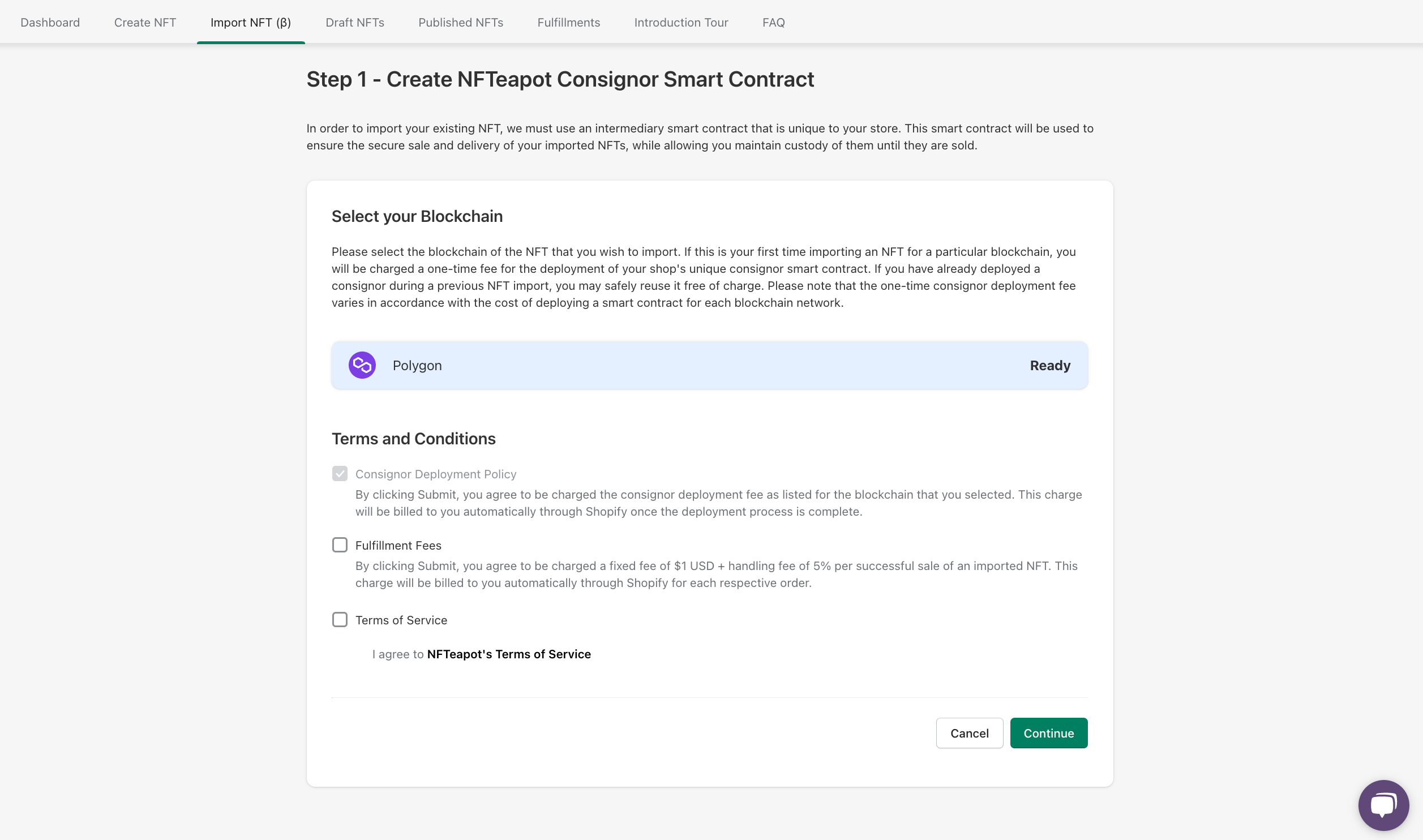 - First we will deploy an intermediary Consignor smart contract that is required to facilitate the NFT transfer. The contract will be unique to your store. Make sure you select the same blockchain your NFTs have been minted on.