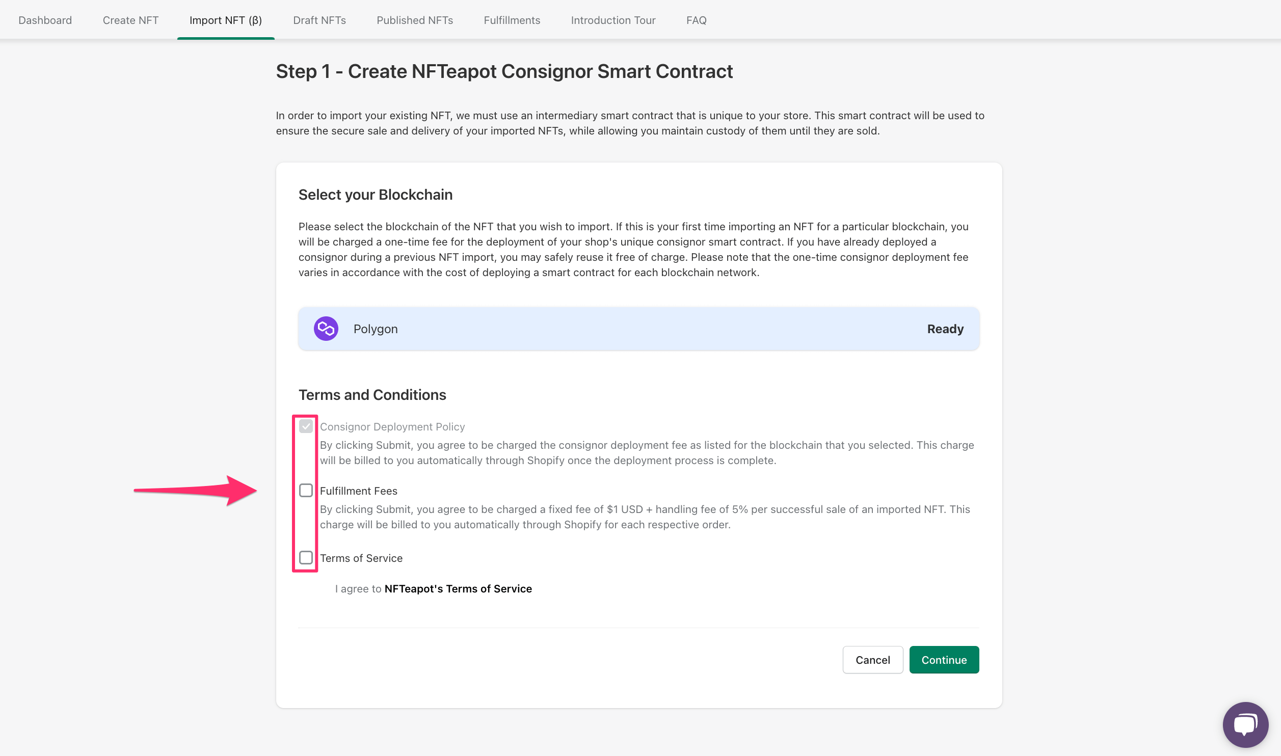Continue, the smart contract may take a few minutes to be deployed. We will send an email to your store email address once the smart contract is ready.