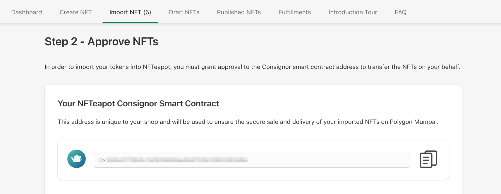 Once deployed, you must grant approval to the Consignor smart contract address to import the NFTs. You will need the following pieces of information:
