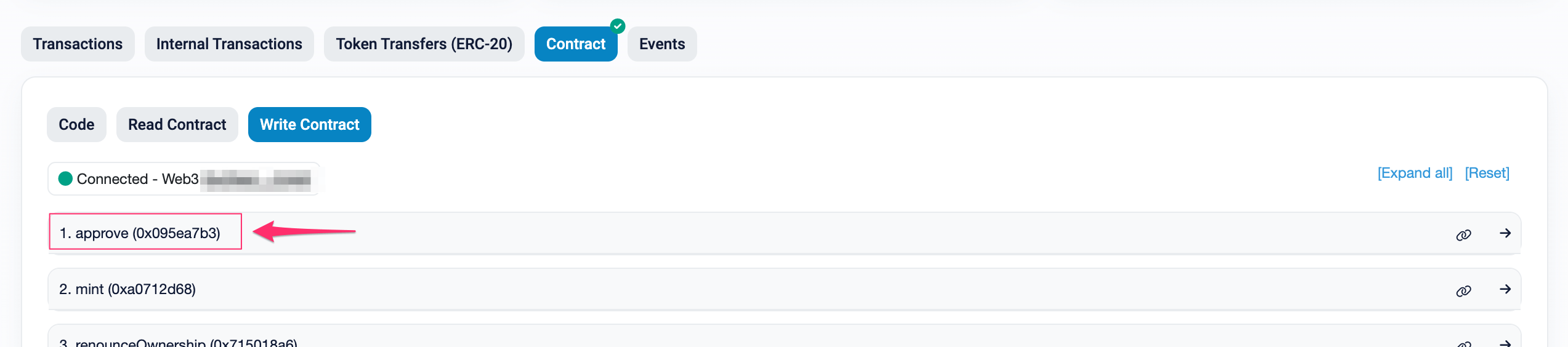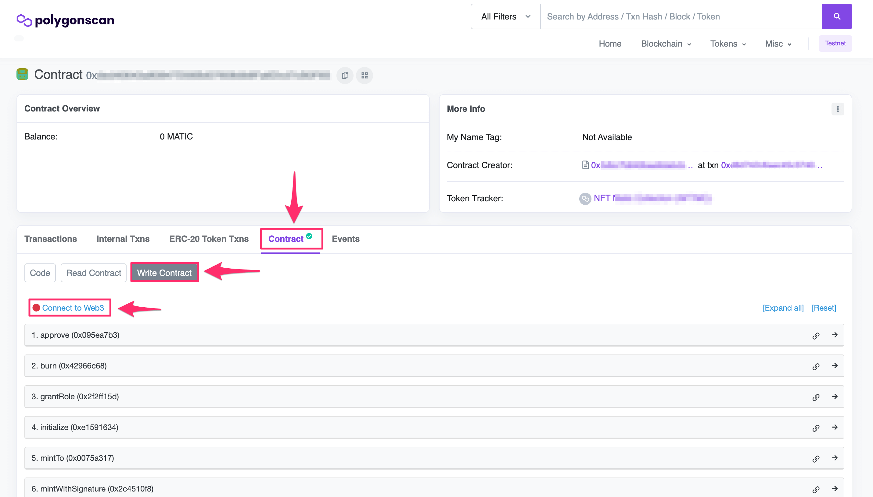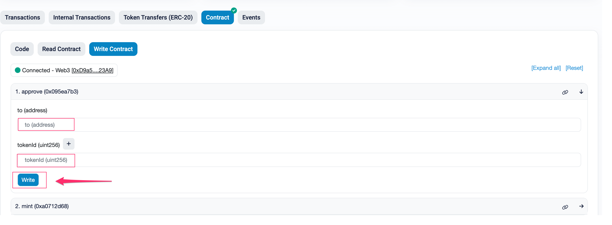 Contracttab, clickWrite Contract, and connect your wallet by clickingConnect to Web3.
