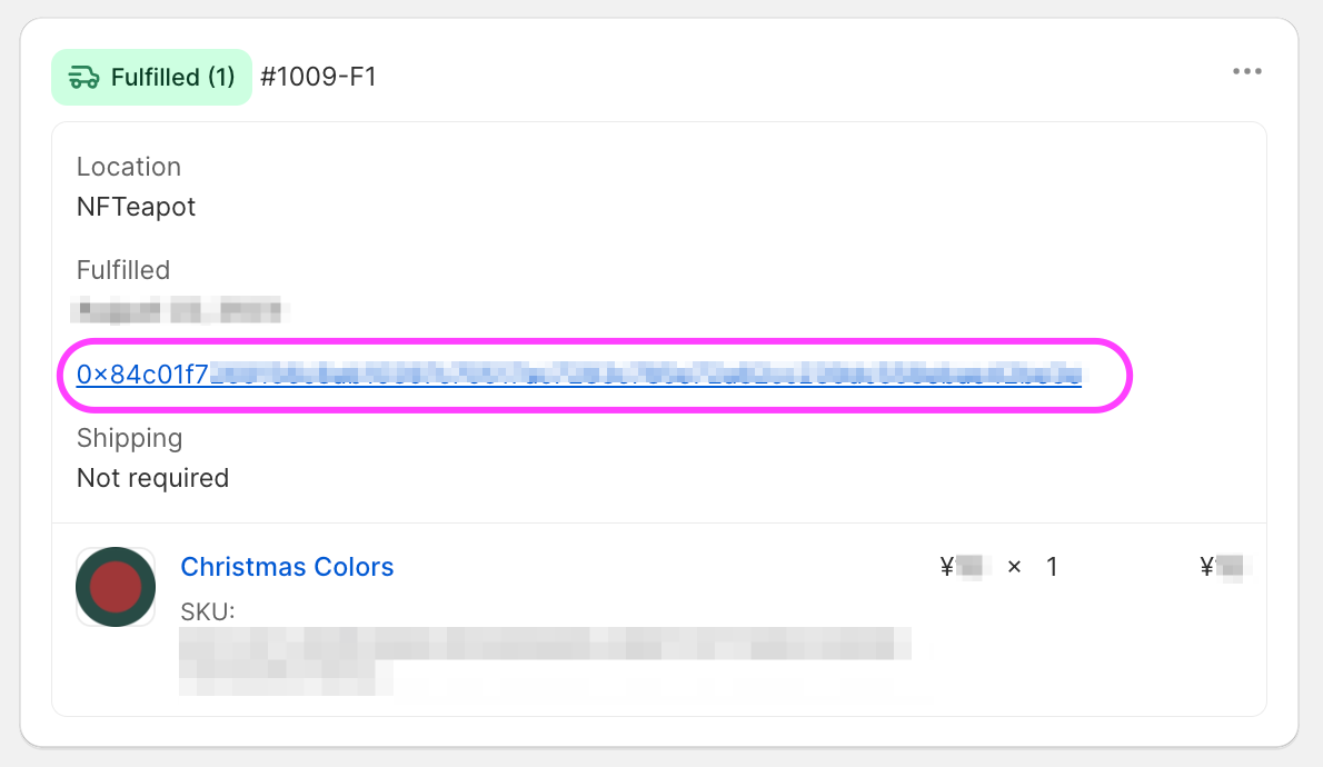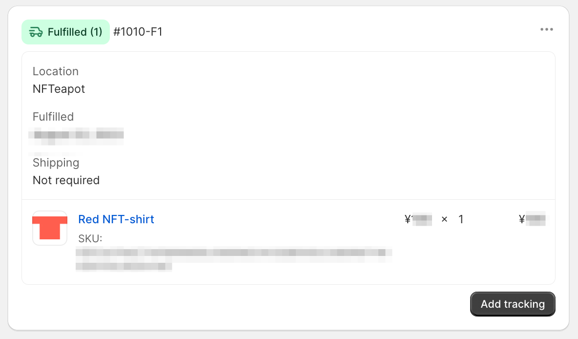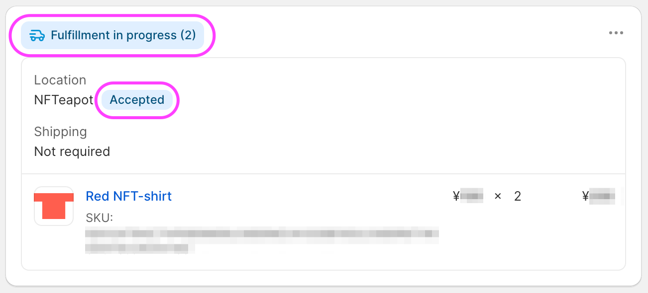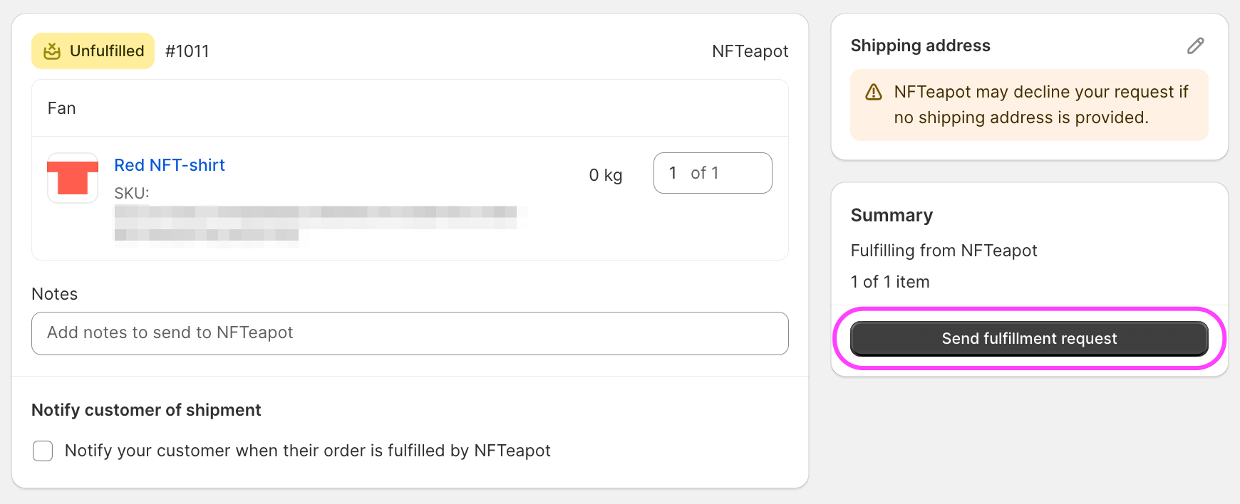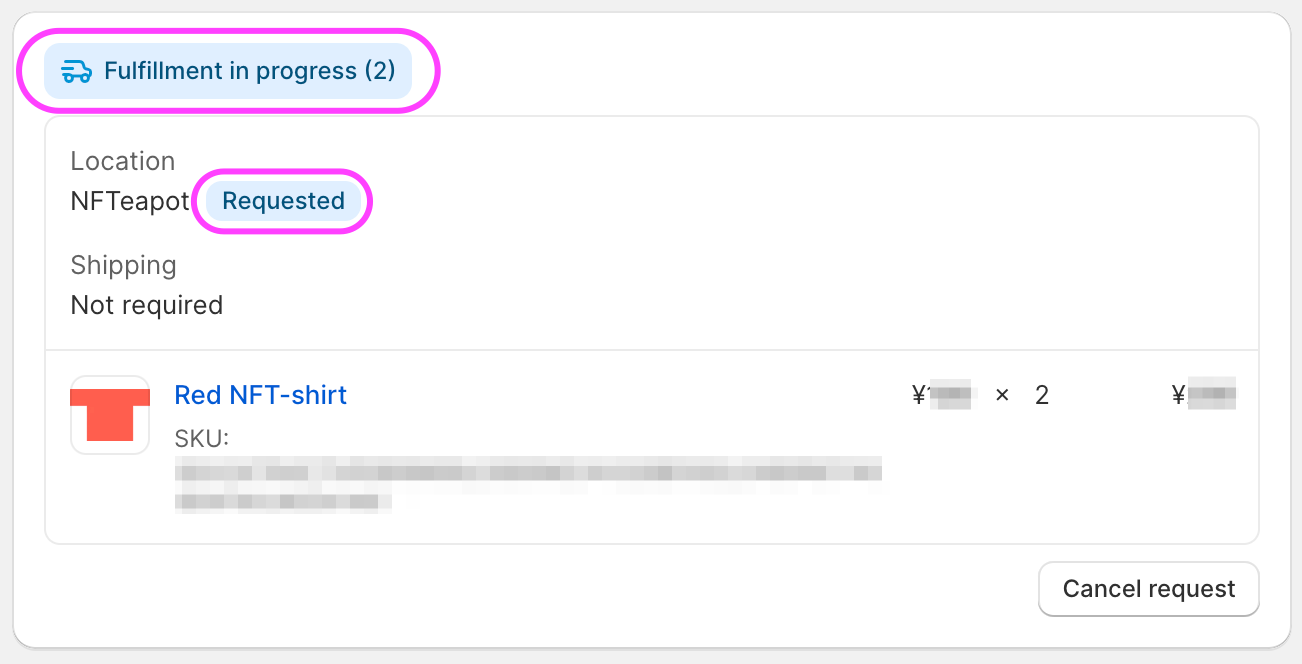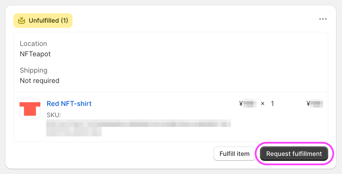 - Location: NFTeapot Requested - The fulfillment request has successfully been sent from Shopify to NFTeapot. The location should soon change to NFTeapot