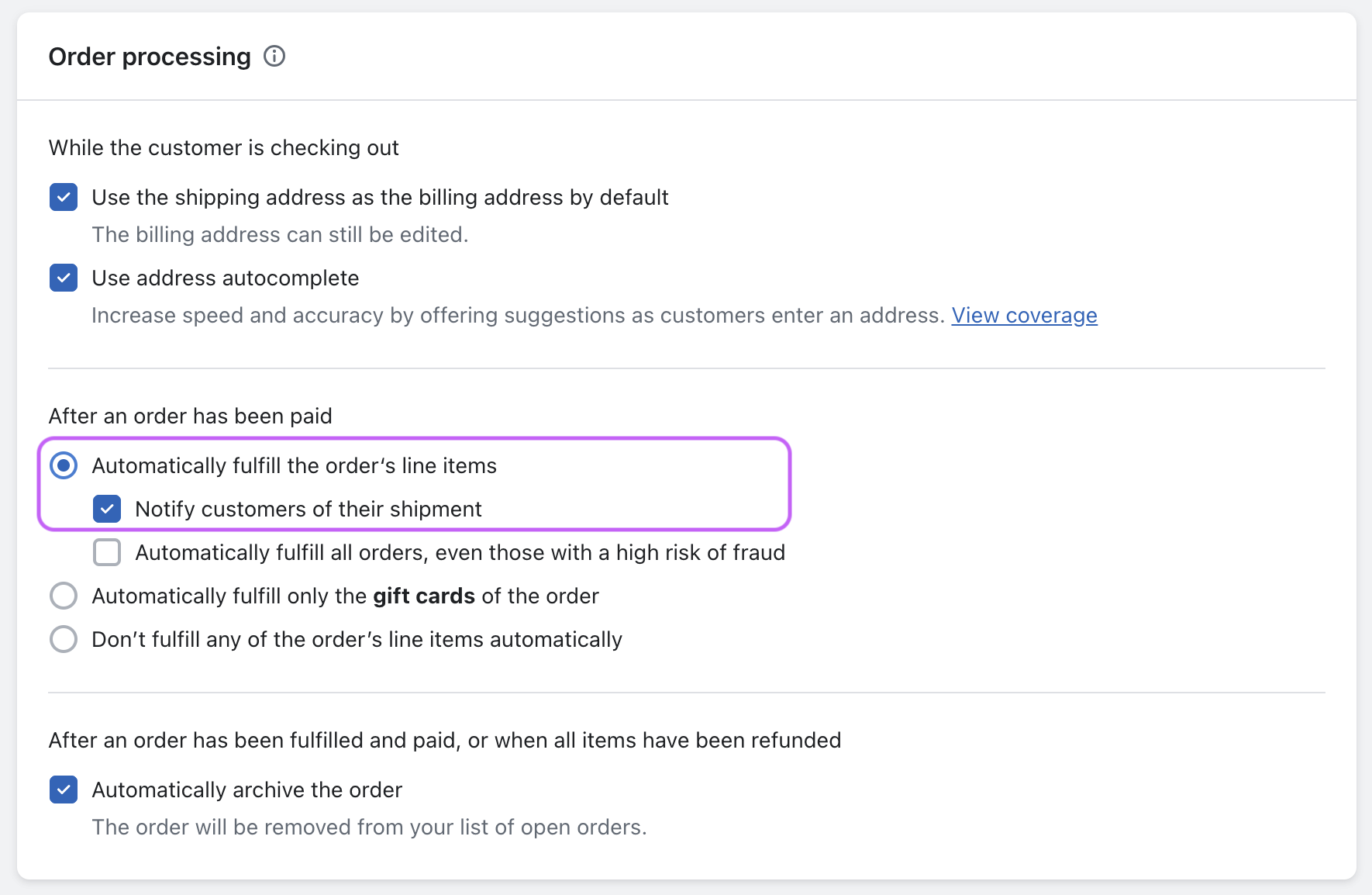 Order Processingsection, selectAutomatically fulfill the order's line itemsandNotify customers of their shipment.